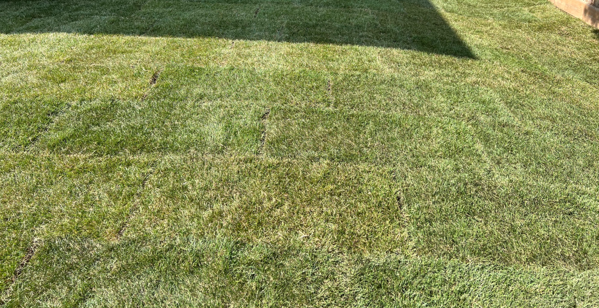 A field of lush green grass under a clear blue sky with scattered fluffy white clouds, no landmarks or people visible.